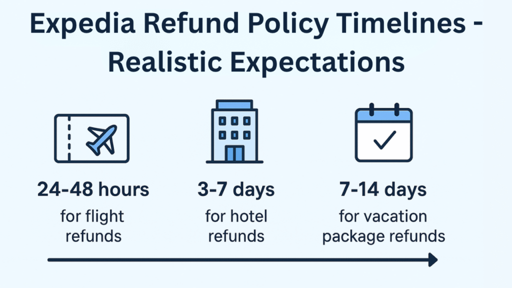 • Card issuer delays: After Expedia/supplier issues a refund, your bank or card provider can take up to a few days to post the credit. Save any refund reference numbers and monitor your card’s pending/posted transactions.